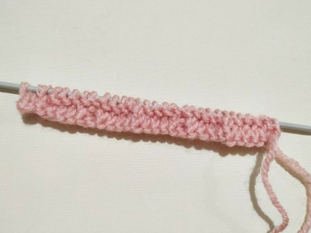 Вяжем далее первый ряд: провязываем петли ширины складки (здесь это 4 петли), следующая петелька будет возвышать складку и ее вяжем лицевой. И снова провязываем петли складки (то есть 4). Следующая петля (10-я) будет занижать складку. И ее мы вяжем изнаночной. Повторяем.