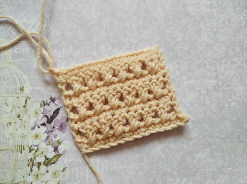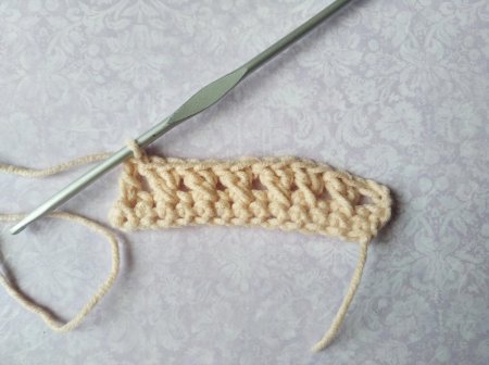 В самом начале ряда мы будем делать 3 ВП и они заменят СтСН. Пропускаем 1 петельку основания и провязываем 1 столбик с накидом. А затем провяжем столбик с накидом в пропущенную петлю. То есть мы как бы перекрестили 2 столбика.