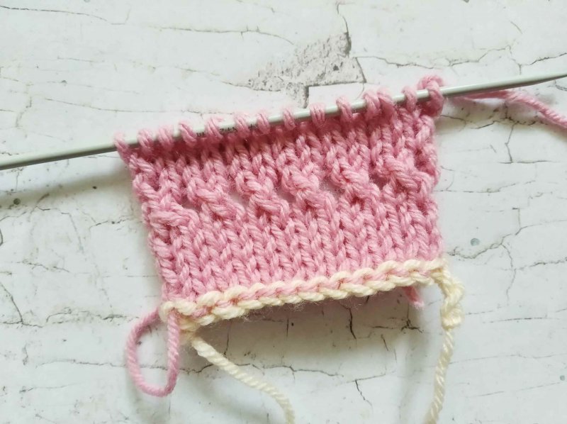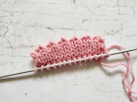 Теперь провяжите нужное число рядов лицевой глади (5-10 рядов). И следующий ряд вяжите так: накид, 2 петли вместе.