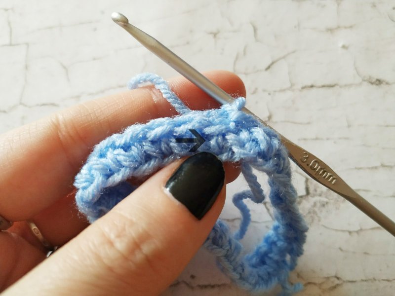Затем провязывать по сути простые столбики без накида, но немного другим способом. Вернее, способ тот же, а место вкалывания крючка немного изменится. Если обычно крючок проводится под петлю, то при данном узоре он втыкается непосредственно в само тело столбика без накида. На фото место вкалывания указано стрелкой.