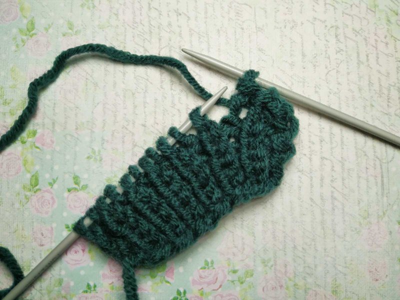 Далее протягиваем эту петельку через оставшуюся петлю на спице. И так мы закрыли одну петлю резинки.