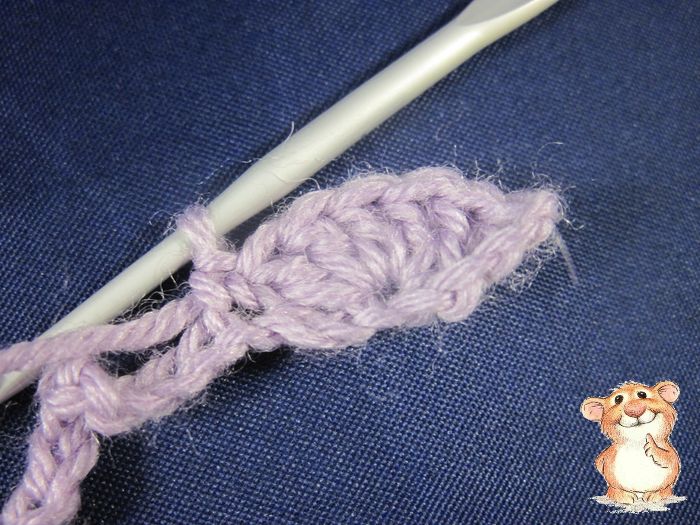 Теперь опишем процесс перехода на второй ряд с боковой стороны. Поворачиваем работу и делаем на крючке подъемные элементы. В данном случае это будут 3 подъемные ВП, которые выступают в качестве аналога среднего столбика из ракушки.