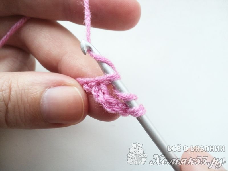 Вместо первого столбика с одним накидом в начале каждого ряда будут выступать три воздушные петельки. Поэтому делаем дополнительно еще три воздушные петли. Накидываем рабочую нить на крючок. Это и называется накидом. Любой накид выполняется перед выполнением самого столбика.