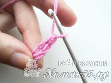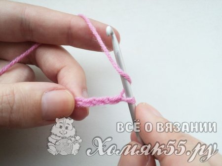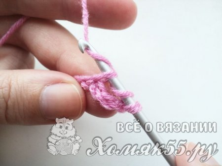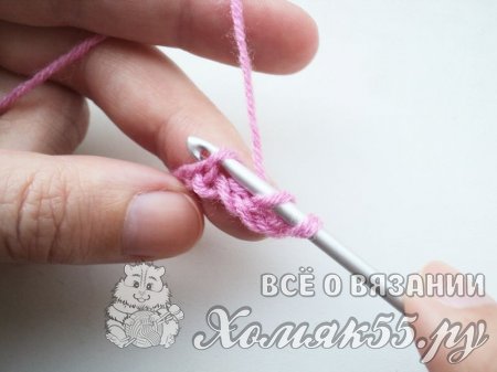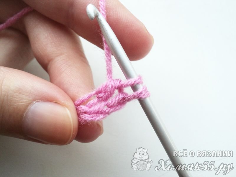 Вводим крючок в четвертую петлю от крючка, так как первые три петли заменяют первый столбик с одним накидом. То есть мы должны отсчитать от крючка 3 петельки.