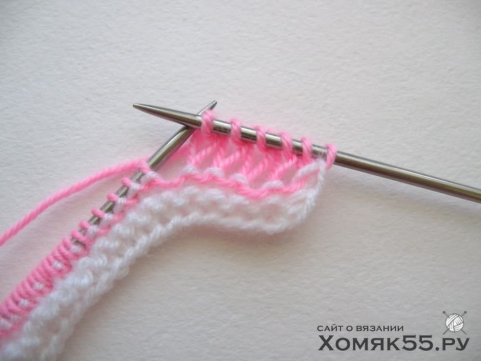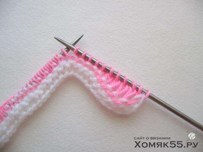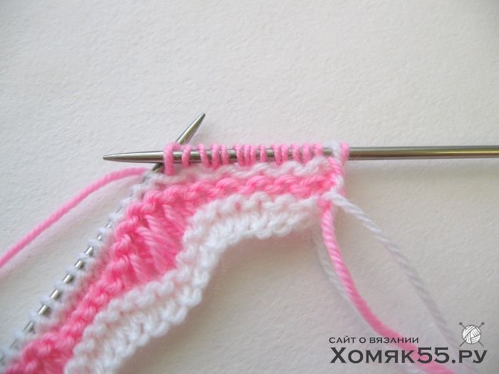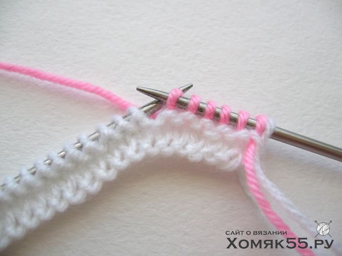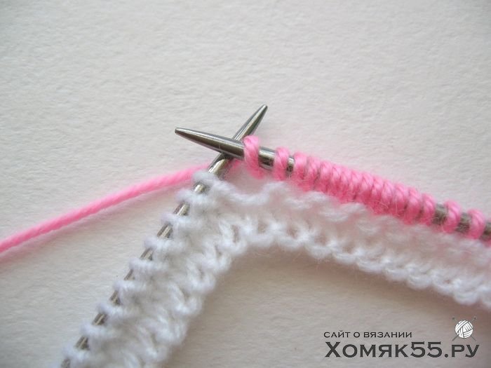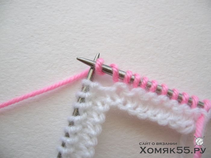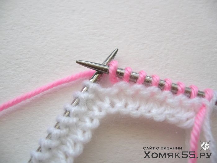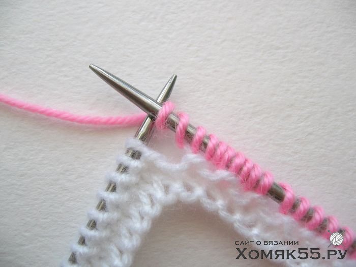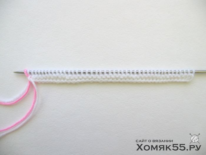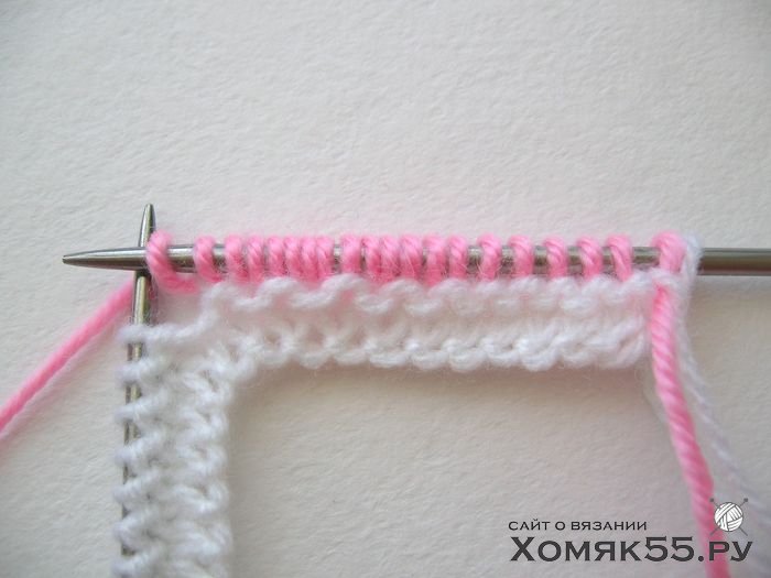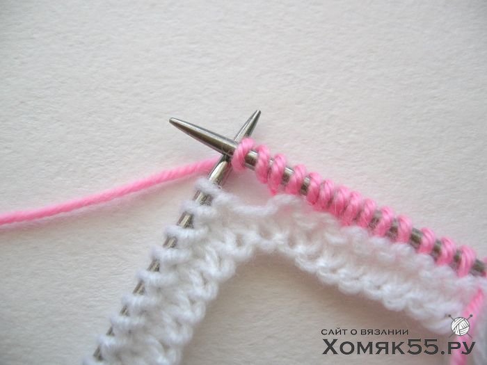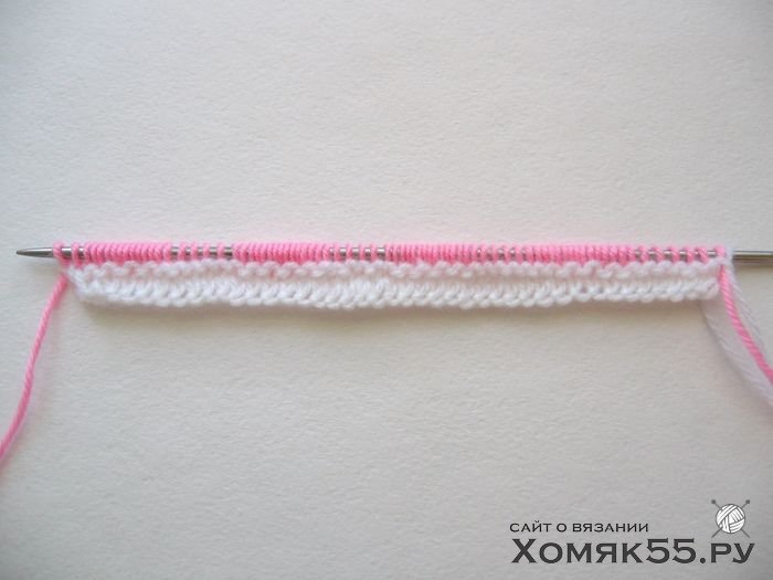 Провязываем все петли лицевыми. Последнюю (кромочную) петлю во 2-м ряду провязываем одновременно белой и розовой нитями и далее так будем провязывать кромочные в каждом 2-м ряду.