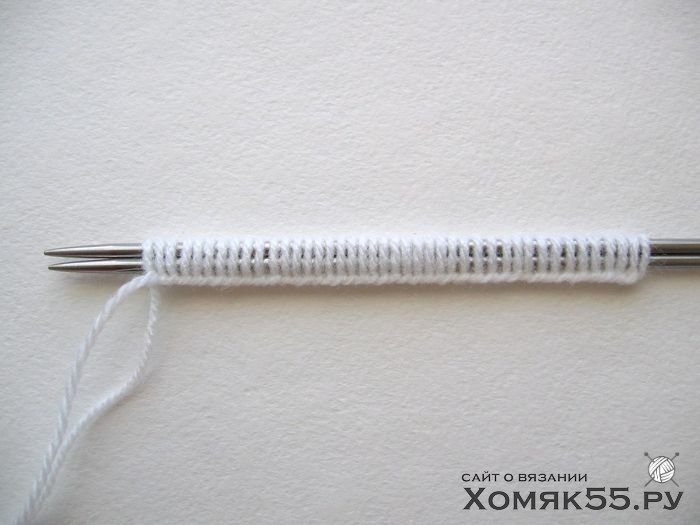 Белой нитью набираем на спицы 42 петли. Число петель должно быть кратно 10-ти плюс 2 кромочные петли.