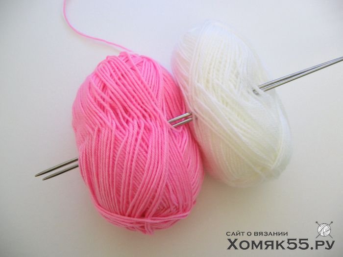 - пряжа розового цвета и белого цветов (40% шерсть, 60% акрил; 100 г / 250 м);