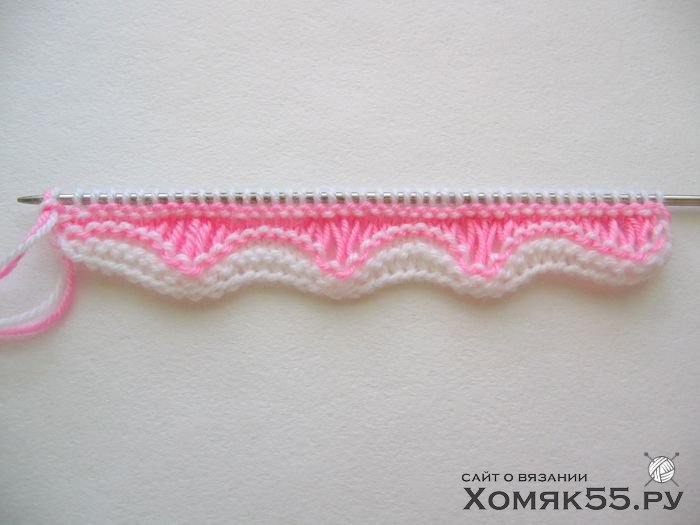 Сняв кромочную, начинаем вывязывать раппорт узора: *первые 5 петель из десяти вяжем лицевыми.