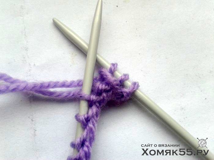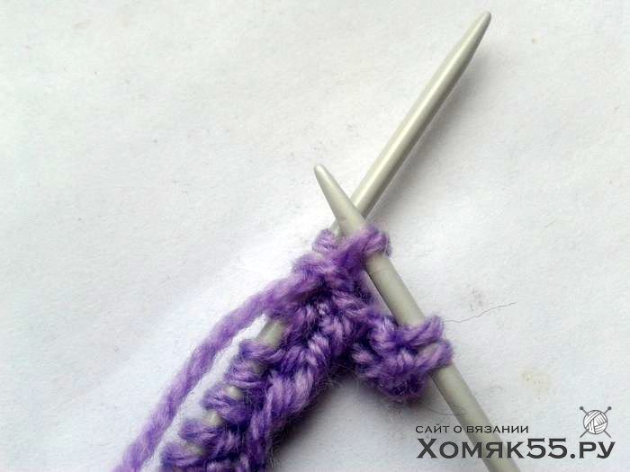 2. Первый лицевой ряд: кромочная петля снимается непровязанной, вторую провязать изнаночной. Далее 2 лицевых, из которых сначала нужно провязать вторую петлю за заднюю стенку, а затем, не снимая петель со спицы, вторую таким же образом.