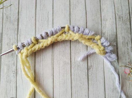6 ряд- вяжем сиреневой нитью все петли лицевыми.