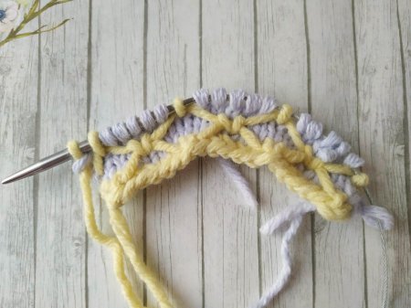 5 ряд- желтой нитью. Кромочная. Нитку помещаем за вязание и снимаем 3 петли. (Затем 1 изнаночная. Нить за работой, снимаем 5 петель) – повторять весь ряд.