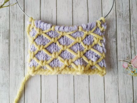 4 ряд- желтая нитка. Кромочная. Снимаем 3 петельки, нитку помещаем за вязание. (Далее спицу вводим под протяжку из 1 ряда. Провязываем 1 лиц в текущем ряду, при этом рабочую нить протягиваем через петлю и через протяжку. Только теперь скидываем провязанную петлю. Нить помещаем за вязание и снимаем 5 петель) – повторять весь ряд.