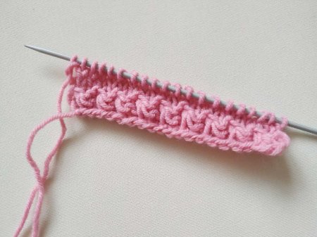 В третьем ряду одиночные петли провязываем изнаночными, а далее снимаем петлю с накидами с еще одним накидом.