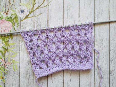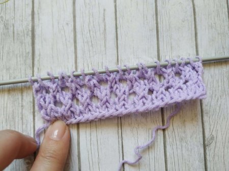 Такой ряд состоит из 6 простых рядов. Раппорт в ширину всего 2 петельки. Это значит, что нужно набрать любое количество петель, делящееся на 2. И, конечно, следует добавить еще 2 дополнительные петелечки для кромки. В каждом ряду провязывать их нужно одинаково. Первую петлю просто переснимать, а последнюю петлю ряда вывязывать изнаночной в любом случае.