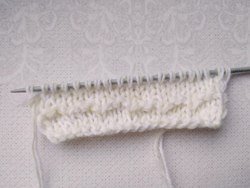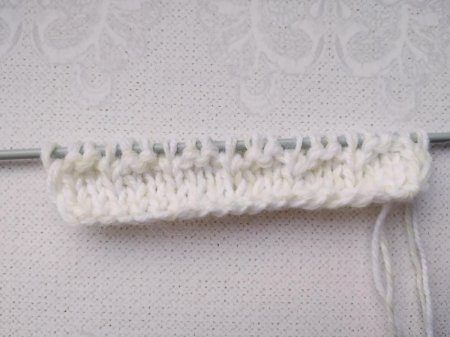 2 ряд: кромочную переснимаем на правую спицу. Все остальные петли провязываем изнаночными.