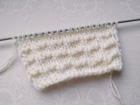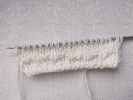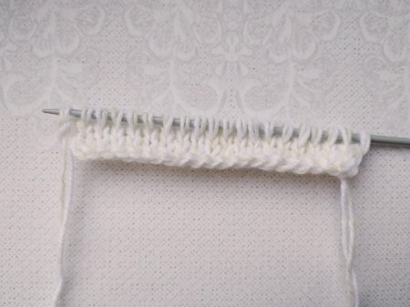 Затем вяжем ряд (изн.п. сторона), где выполняем 2 л.п. и 1 изн.п. петли. Повторяем раппорт нужное количество раз.