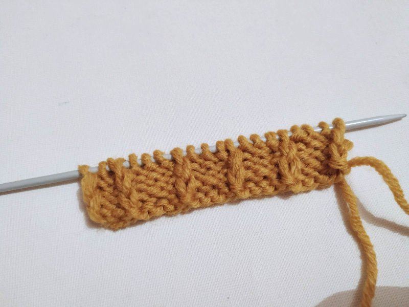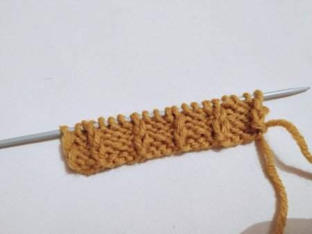 1 ряд (лицевой): 3 изн\п. Затем отводим нитку за вязание и снимаем следующую петлю. Раппорт узора в ширину связан, это значит, что дальше будем просто повторять до конца ряда.