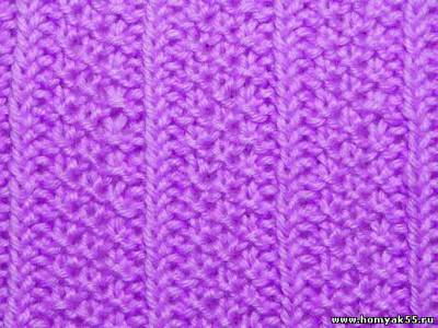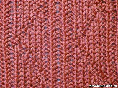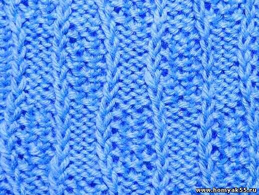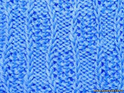 Основанием для выделения узоров из скрещенных петель в отдельную группу служит способ их провязывания. Скрещенные петли можно получить, провязывая петли особым способом или совмещая лицевые и изнаночные разных типов. Их использование в работе дает возможность получить очень красивые узоры. Кроме того, скрещенными петлями можно вязать изделия лицевой гладью, что само по себе станет украшением полотна.1-й ряд: * 1 лиц. скр. п., 1 изн. скр. п. *, повторять от * до *;