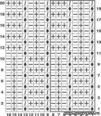 12-й, 14-й, 16-й, 18-й и 20-й ряды: * 3 лиц. п., 1 п. снять, 1 изн. п., 1 лиц. п., 1 изн. п., 1 п. снять *, повторять от * до *.