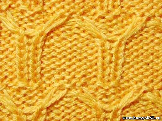 11-й ряд: 4 п. перекрестить направо (3 изн. п. оставить на вспом. спице за работой, 1 лиц. п., затем провязать изнаночными 3 п. со вспом. спицы), * 4 п. перекрестить налево (1 снятую лиц. п. оставить на вспом. спице перед работой, 3 изн. п., затем провязать лицевой снятую п. со вспом. спицы), 4 п. перекрестить направо (3 изн. п. оставить на вспом. спице за работой, 1 лиц. п., затем провязать изнаночными 3 п. со вспом. спицы) *, повторять от * до *;