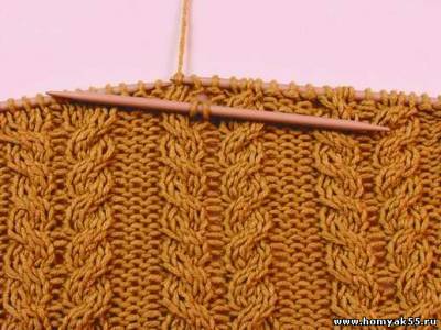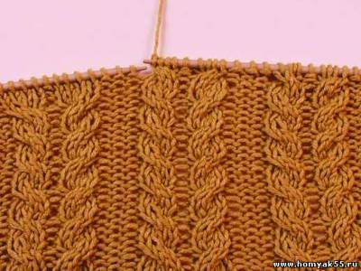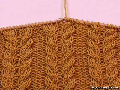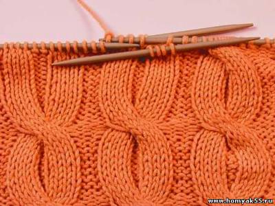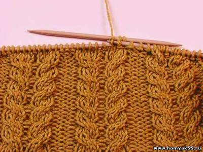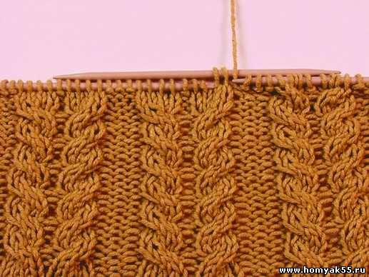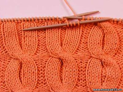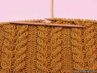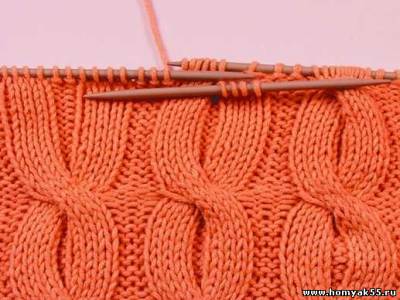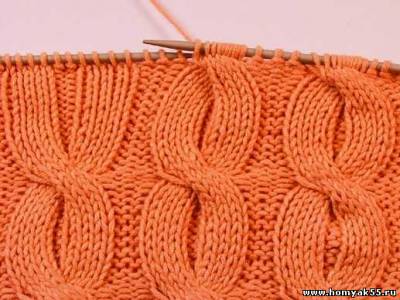 Довязав до места перекрещивания петель, две петли переведите на вспомогательную спицу. Оставьте ее за работой.
