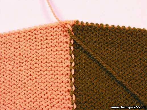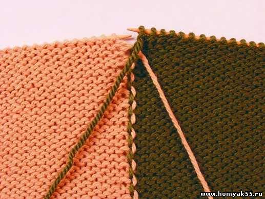 При вязании вертикальных полос, прежде чем приступить к выполнению полосы другого цвета, светлую нить перекиньте на темное полотно. Это делается для того, чтобы в процессе вязания вертикальных полос не образовались отверстия на полотне.