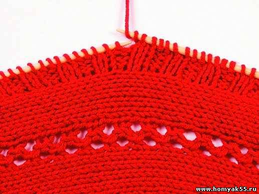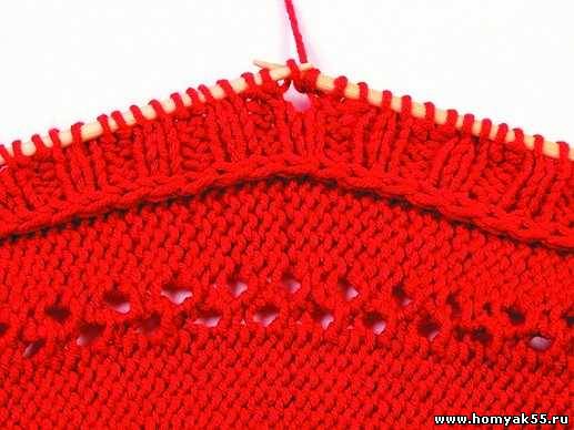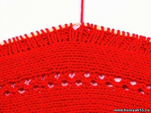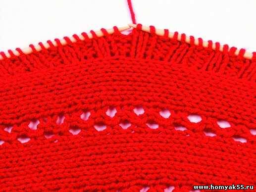 Для того чтобы облегчить работу, места для предполагаемых отверстий можно отметить либо мелом, либо цветными нитями. Довязав до места отверстия, на правую спицу сделайте накид. (Рекомендуется делать накид только после лицевой петли).