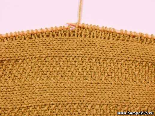 Для вывязывания вертикальных отверстий полотно вяжите основным рисунком. Довязав до планки, разделите ее на две равные части, левую половину планки провяжите на высоту отверстия, вывязывая со стороны отверстия кромочные. Нить после вывязывания должна остаться со стороны отверстия, после этого ее оборвите.