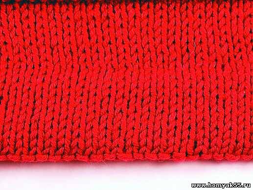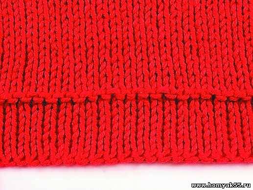 Далее вяжите остальные ряды лицевыми петлями. После того как количество рядов до и после изнаночного ряда будет одинаковым, сложите полотно пополам. Сгиб должен проходить по ряду изнаночных петель.