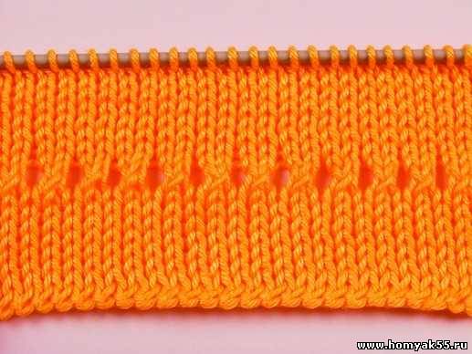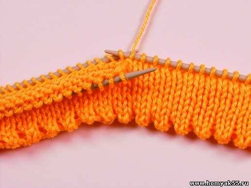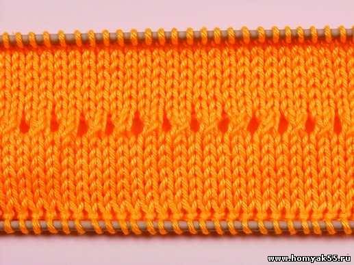 Затем сделайте накид. Чередуя провязывание двух петель вместе лицевой и накиды, выполните весь ряд.
