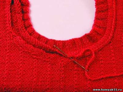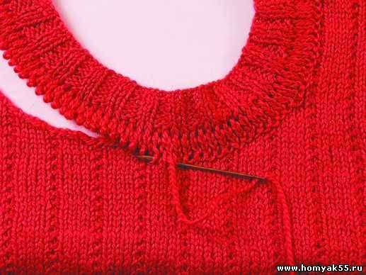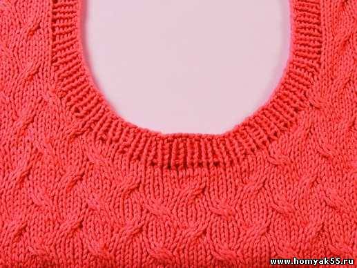 Как и в предыдущем способе, горловина вяжется отдельно и пришивается при помощи кеттельного шва.