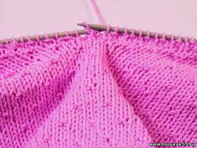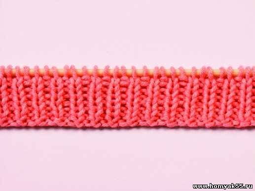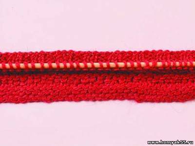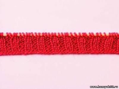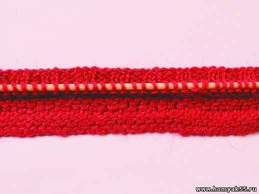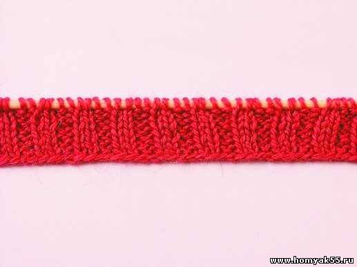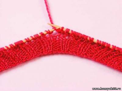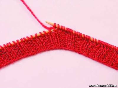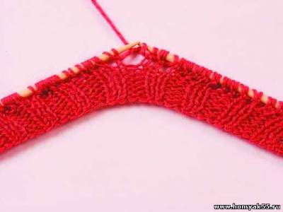 Первый ряд вяжите резинкой. Когда дойдете до середины мыса, спицу введите в первую и третью петли на левой спице.
