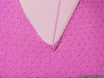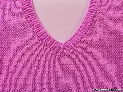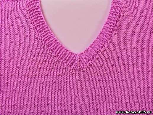 При вывязывании V-образного выреза петли набирайте по кругу, начиная от мыса переда со стороны левого плечевого шва.