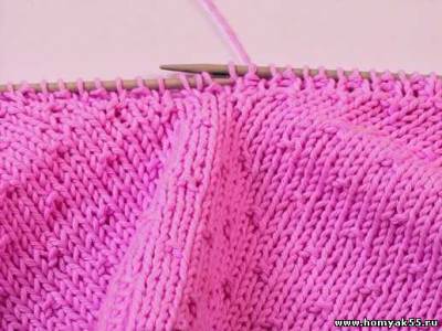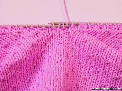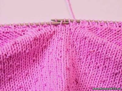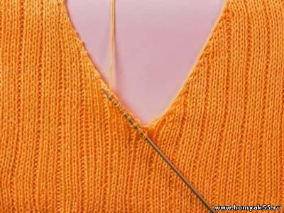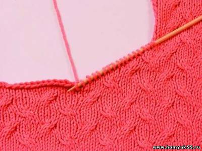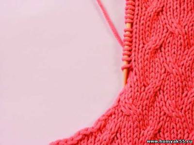 При вывязывании горловины одной спицей набирайте петли по краю полотна из кромочных. Важно отметить, что при использовании данного способа вырез горловины условно разделяется на несколько частей. На каждом таком отрезке петли набираются особым способом. Часто петли горловины набирают из кромочных, однако в изделии лучше будут смотреться петли, набранные из петель ниже кромочных. На вертикальном участке выреза петли набирайте именно этим способом.