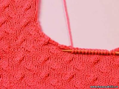 На скошенных участках горловины петли набирайте таким образом, чтобы выровнять окат. А именно: спицу вводите в соответствующую петлю, но на один ряд ниже и вытягивайте нить.