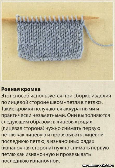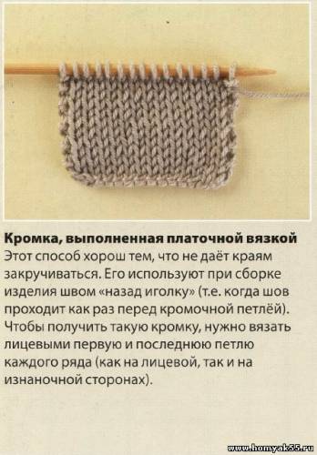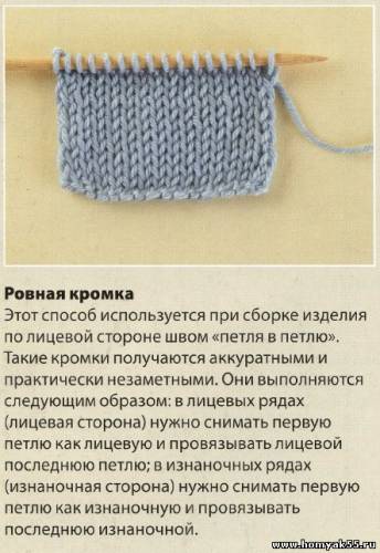 Кромками называют вертикальные края полотна. Они могут исчезать при сборке изделия, (т.е. уходить в шов), или же оставаться на виду (как у шарфа, например).Если кромки полотна исчезнут в шее, то лучше либо выполнить их платочной вязкой, либо просто сделать ровную кромку: при вывязывании кромочных петель этими способами край получается плоским и аккуратным, что значительно облегчает дальнейшую сборку изделия. Первый способ используется при сборке по лицевой стороне швом «петля в петлю», а второй - при сборке по изнаночной стороне (т.е. детали располагаются лицевой стороной внутрь) швом «назад иголку» или «через край».