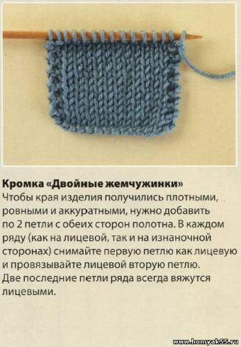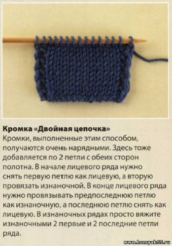 Если в вашем изделии кромки останутся на виду, то лучше выполнить их одним из декоративных способов, благодаря чему вы и края украсите, и прочности им придадите. Такая кромка вывязывается на двух петлях, что, во-первых, эффектно подчеркивает край, а во-вторых, не дает изделию закручиваться по бокам. Существует немало способов декоративного выполнения кромок - от самых простых до замысловатых. Но чаще всего используются «Двойные жемчужинки» и «Двойная цепочка».