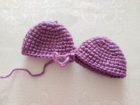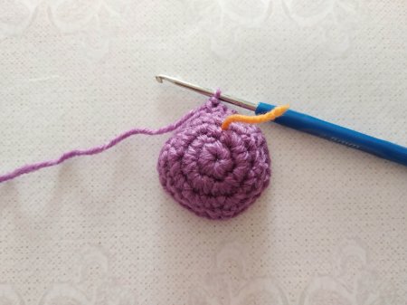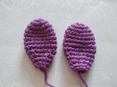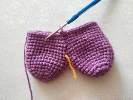 Далее вяжем вторую деталь точно так же. Теперь их нужно соединить. Поэтому от второй детали не обрываем нить и не фиксируем ее. Крючок заводим в петлю первой детали и вяжем теперь по кругу.