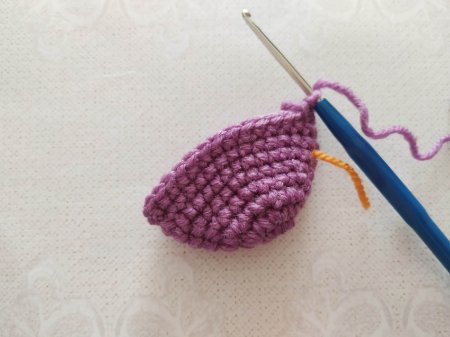 Когда останется 34 петли, вяжем с убавками через 2 петли весь ряд. В следующем ряду через 1 петлю. Закрываем вязание убавками по кругу. Не забываем наполнить деталь синтепоном.