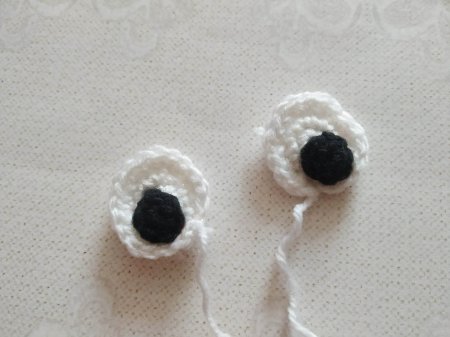 Вяжем глазки белой нитью. Делаем скользящую петлю, затягиваем.